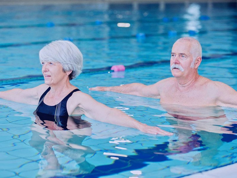 AquaFit ist ein schonendes Ganzkörper-Training, bei dem die Kraft, Beweglichkeit, Koordination und Ausdauer gestärkt werden und zusätzlich das Herz-Kreislauf-System angeregt wird. Die Übungen im 30°C warmen Wasser erlauben eine relativ beschwerdefreie Ausführung unter Entlastung der Gelenke, fördern aber durch den Widerstand des Wassers gleichzeitig eine verstärkte Muskelarbeit. Fachlich versierte Therapeut:innen leiten und kontrollieren die Übungen.